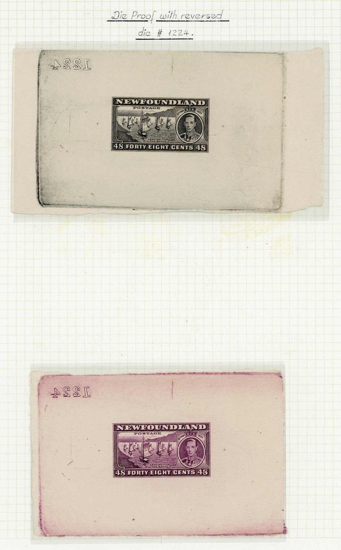 48c. The Banks Fishing Fleet (2) in purple on wove paper (100x65mm.) and in black on wove paper (123x63mm.) showing complete die impressions and die numbers