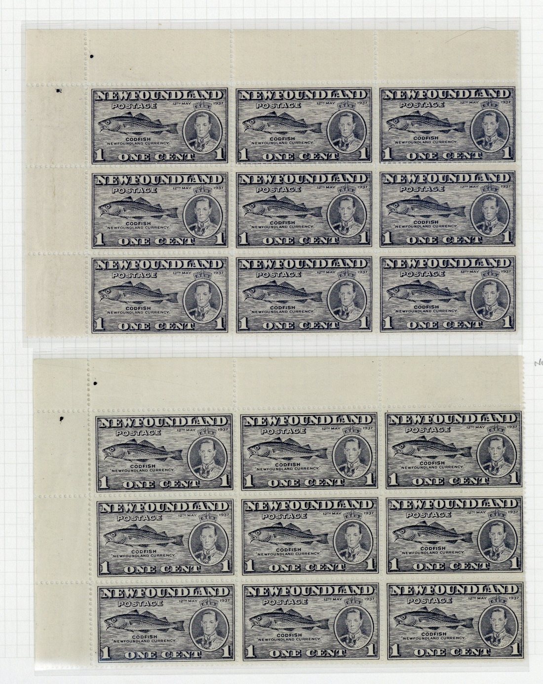 1c. grey selection, comprising perf. 13¾, 14 and 13½ blocks of four with one in each showing fish-hook flaw, perf. 13½, 14 and 13 upper left corner blocks of twelve (3x4) with Row 2/1 in each showing frame-line re-entry and Row 3/3 unerased guide line, a perf. 14 normal block for comparison, perf. 13½x14 upper left corner block of four with Row 2/1 showing frame re-entry, and perf. 14 upper right corner block of ten (2x5) with partial double perfs. between stamps and margin, fine mint