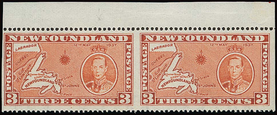 3c. orange-brown Die I line perf. 14 horizontal marginal pair from the top of the sheet, variety imperforate vertically, and the left-hand stamp showing cigar stub flaw, fine unmounted mint and rare, particularly with the flaw. S.G. 258 var.; Scott 234i, $1,800++. Photo