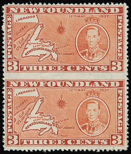 3c. orange-brown Die I line perf. 13½ vertical pair, variety imperforate between, fine mint S.G. 258cb, £650. Photo