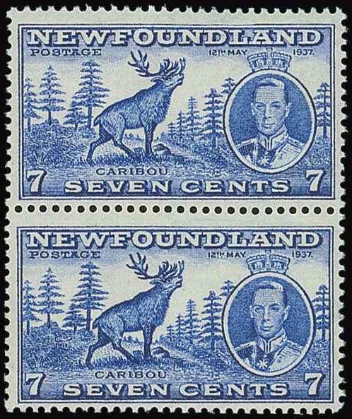 7c. bright ultramarine, comb perf. 13 vertical pair, the upper stamp Row 3/3 major re-entry, fine unmounted mint; top stamp with a small gum bend. A rare multiple of this scarce stamp, particularly with one of the two major re-entries. S.G. 259d, £1,400+. Photo