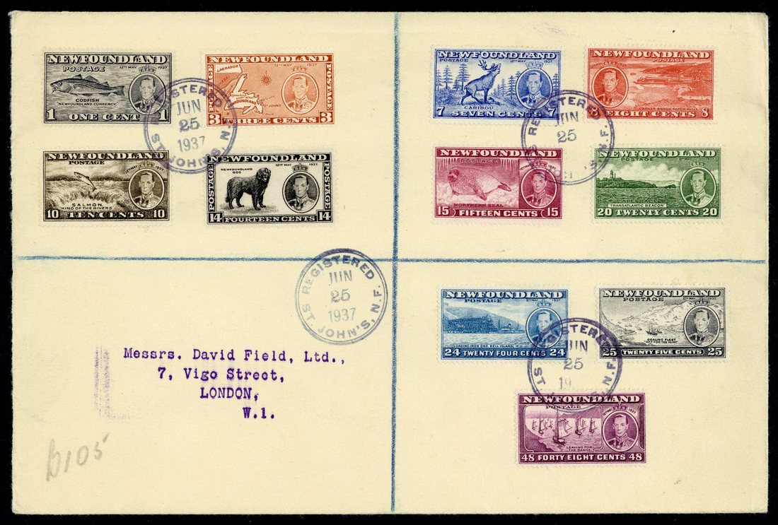 7c. bright ultramarine, comb perf. 13 used with the other ten values of the set on 1937 (25 June) David Field envelope (229x152mm.) registered from St. John's to London. A rare stamp used, particularly on cover. R.P.S. Certificate (1979). S.G. 259d, £800+