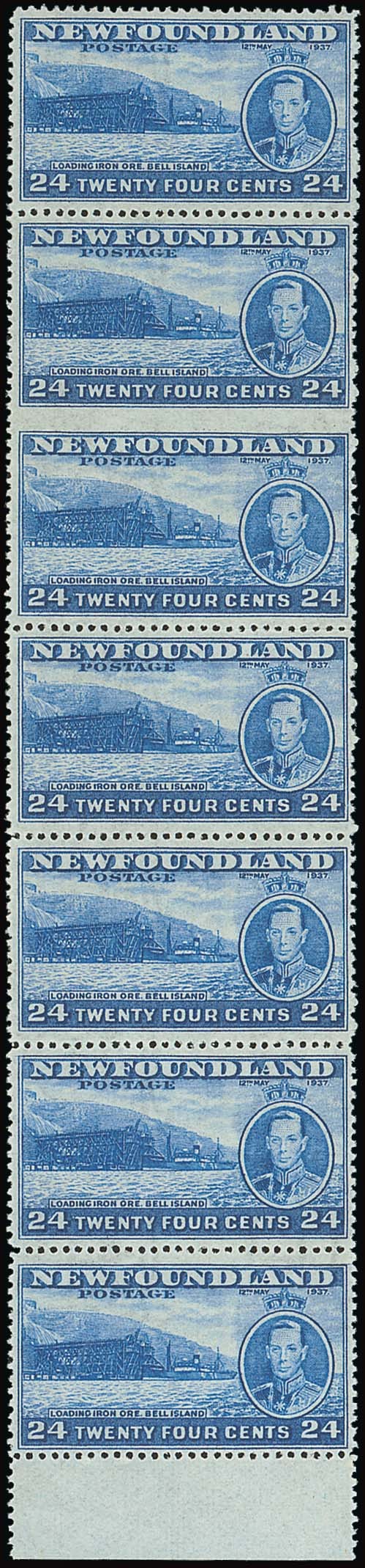 24c. light blue line perf. 13½ marginal vertical strip of seven from the foot of the sheet, the second and third stamps variety imperforate between, unmounted mint; fine and rare. S.G. 265cb, £3,500+. Photo