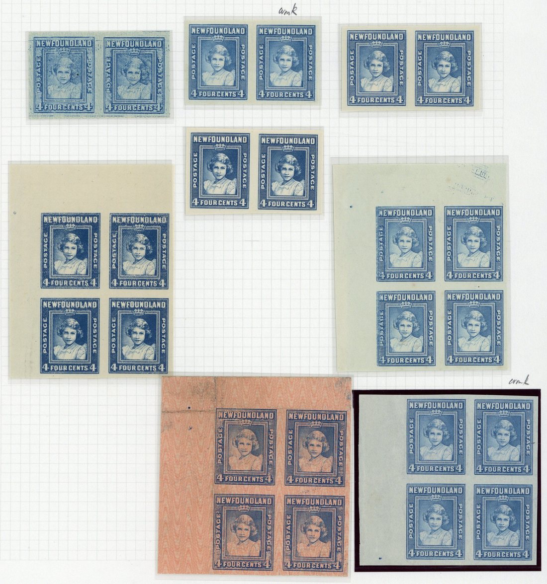 A selection of imperforate plate proofs in shades of blue, comprising two corner blocks of four on "bookend" paper, one with pink surface, two corner blocks of four and three pairs on various thicknesses of wove paper, and a marginal block of four and a pair on watermarked paper. An attractive group