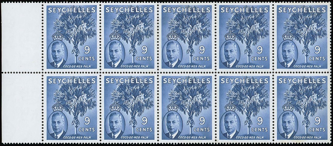 9c. chalky blue block of ten (5x2) with margin at left, variety Crown missing between the fourth vertical row, fine unmounted mint. S.G. 160a, £1,400. Photo