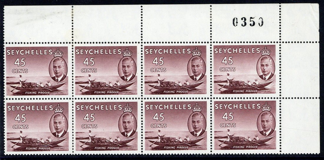 45c. purple-brown upper right corner block of eight (4x2) with sheet number, the second vertical row sharing St. Edward's Crown, mounted in the selvedge only. S.G. 166b, £475
