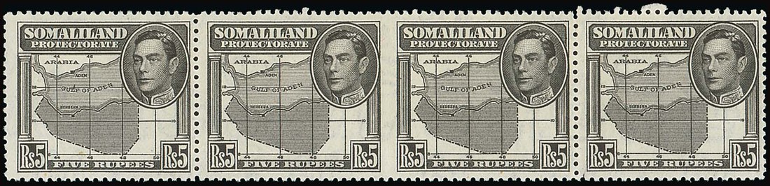 1938 5r. black strip of four, the centre pair variety imperforate between, fine unmounted mint. Extremely rare, only six mint pairs known to exist. An exhibition showpiece. S.G. 104a, £28,000. Photo