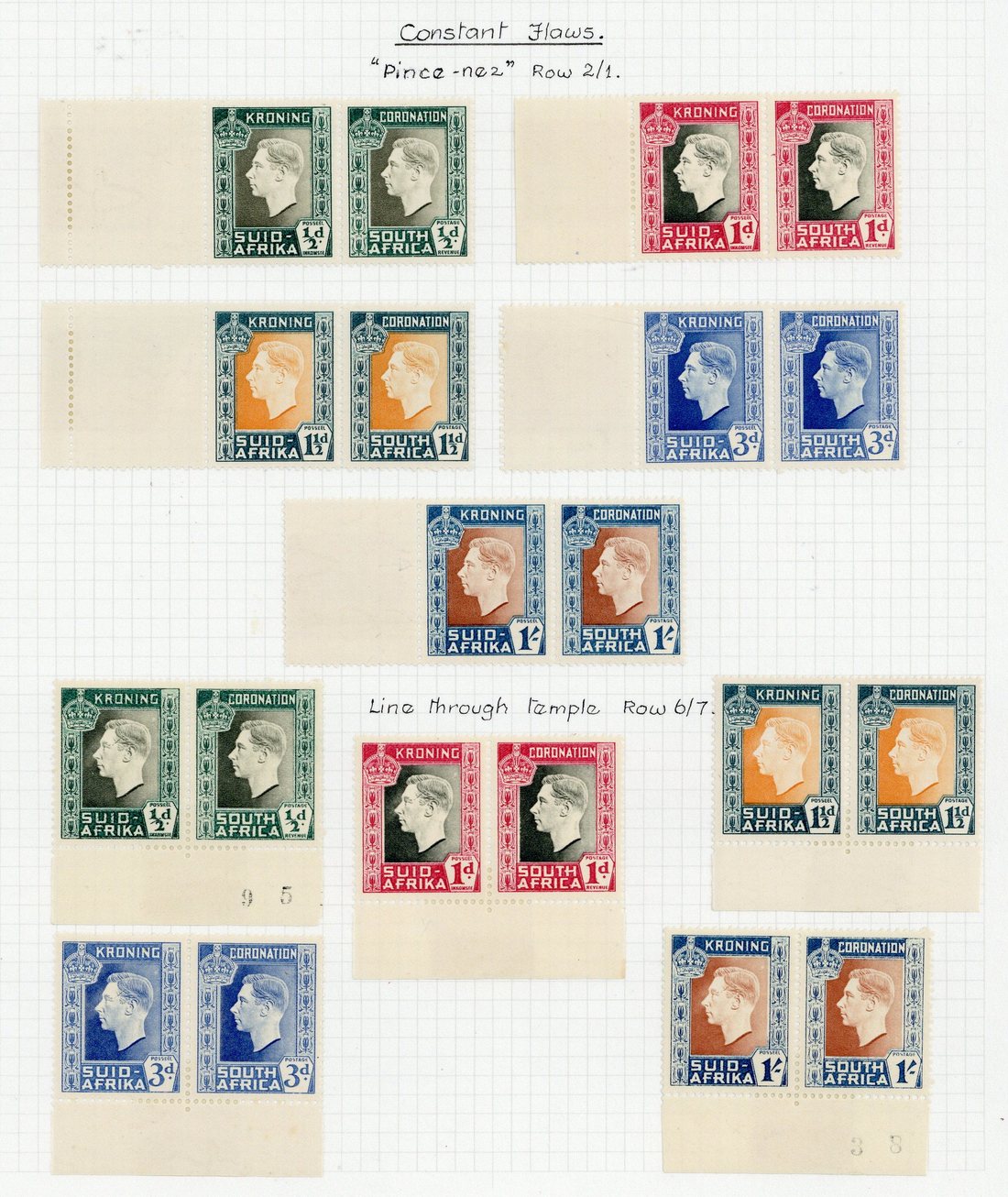 1937 Coronation selection, comprising three sets of five pairs with one in each showing varieties pince-nez, frozen breath and line through temple, 1½d. pair with mouse by "suid", 3d. pair with dot in value tablet and 1/- marginal block of four and two pairs with one in each showing hyphen on Afrikaans stamp omitted, fine mint. Cat. £275