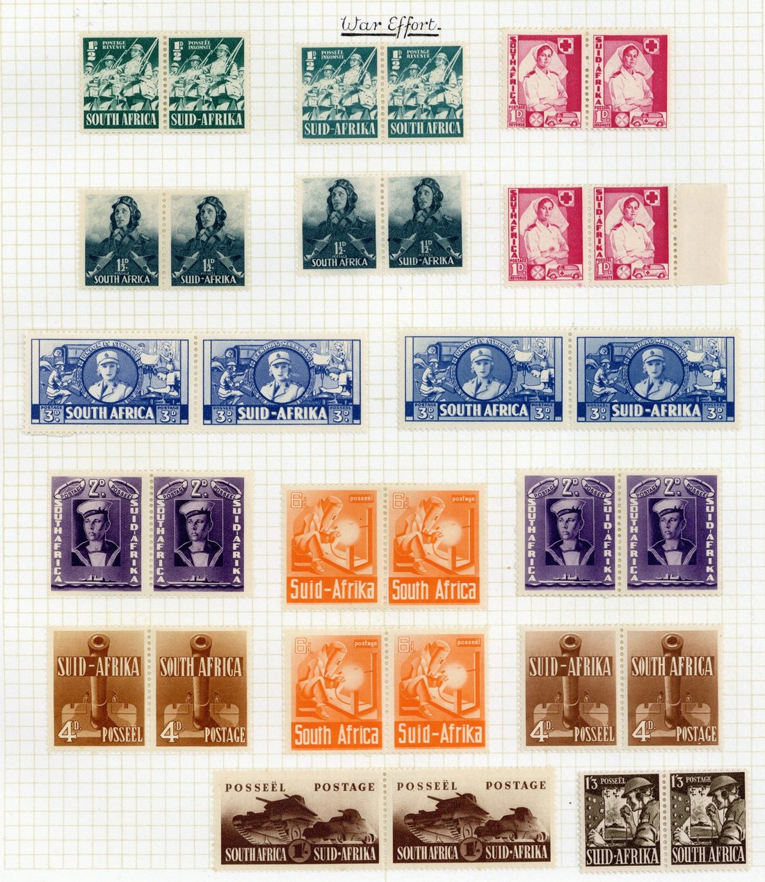 1941-46 War Effort mint collection arranged on album pages, a range of blocks of four or larger with some showing sheet numbers, a few with varieties including 3d. cigarette flaw in pair, and 1/3d. with and without adverts; also further selections on stock leaves with mint and used multiples