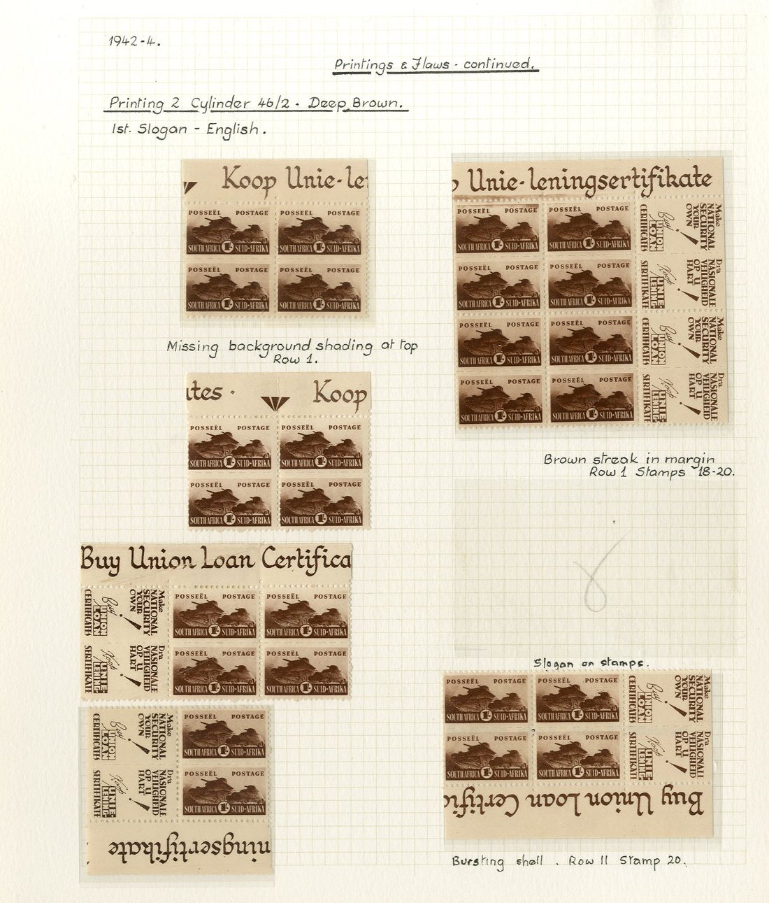 A mint collection neatly mounted and arranged on thirty-one pages and contained in a maroon Godden de-Luxe album, nearly all in multiples arranged by printing and mostly marginal, a number of varieties including 1d. unit with roulettes omitted (thinned), 1d. block of three units with roulettes misplaced, 1½d. selection of units with double roulettes, 1½d. marginal pair (stains) with roulettes omitted, 2d. range with misplaced perforations and a marginal pair with albino print, 2d. apostrophe and line on cap flaws, 3d. marginal unit with unit with under-inked slogans, 6d. corner block of four units with marginal inscription encroaching on to stamps, 1/- bursting shell in two corner blocks, 1/- missing background on marginal or corner pairs of units, etc. also a further mint and used selection on stock leaves; generally fine and an interesting lot of these fascinating stamps