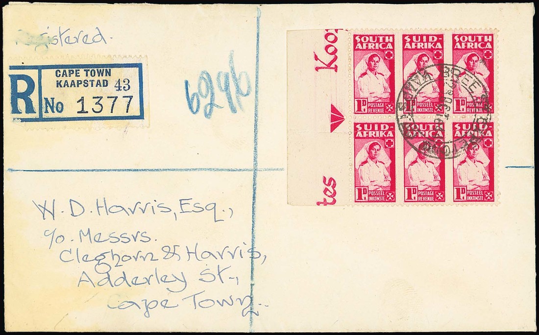 1d. carmine pair of units with arrow sheet margin at left, variety both roulettes omitted, neatly cancelled by Bree Street, cape Town c.d.s. on 1944 (28 Oct.) envelope registered locally; envelope with a little soiling at left, the block fine. A rare block, particularly on cover. S.G. 98b, £2,400+. Photo