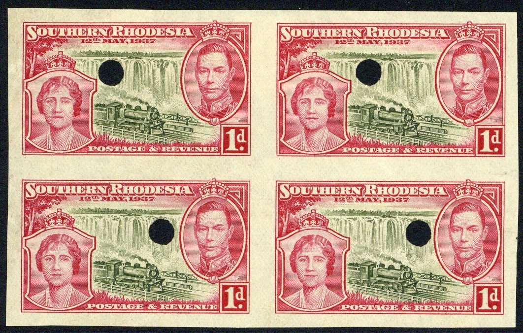 1937 Coronation imperforate plate proof selection, comprising 1d. block of four with each having 4mm. hole puncture, 2d. marginal pairs (2) and blocks of four (2, one showing both die numbers) from the sole record sheet with three showing printer's correction "circles"; the latter group with some faults as with so many from this one sheet
