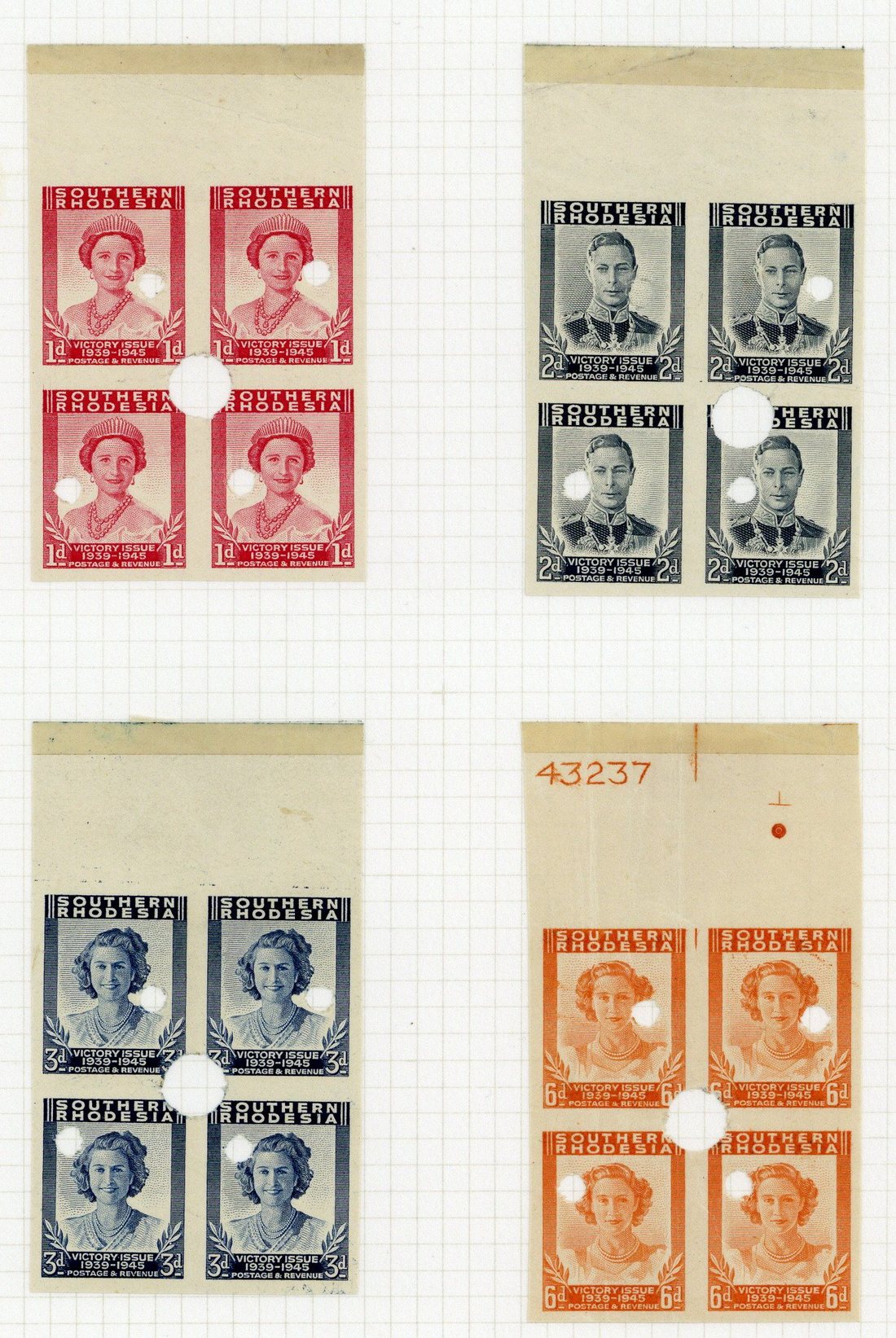 The set of four with additional 1d. and 2d., all in blocks of four on gummed unwatermarked wove paper, the set marginal with the 6d. showing die number, each stamp with a 3mm. hole puncture and sharing a central 8mm. hole puncture, the additional 1d. and 1d. mounted on modern presentation cards. A fine group from the printer's record sheets