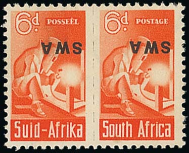 6d. red-orange pair with overprint inverted, one with tiny speck at foot on reverse otherwise fine mint. B.P.A. Certificate (1969). S.G. 128a, £650. Photo
