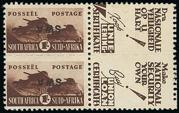1/- brown pair (Type 31) with slogans at right, variety overprint inverted, fine mint. R.P.S. Certificate (1990). S.G. 130c, £650. Photo