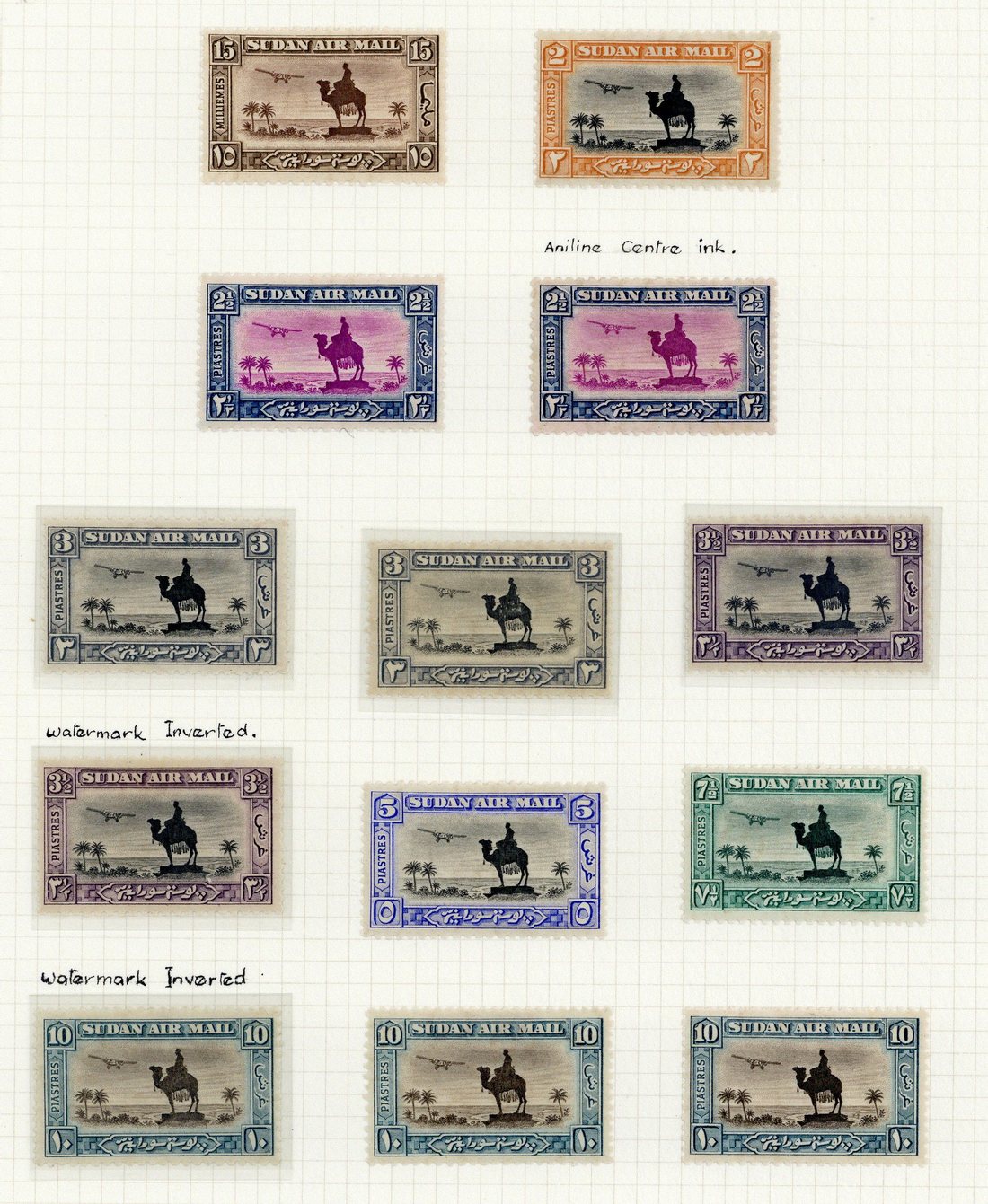 1936-37 Air, perf. 11½x12½ 15m., 2p., 2½p. (2, one with aniline vignette), 3p. (2), 3½p. (2, one with watermark sideways inverted), 5p., 7½p. and 10p. (3, one with watermark sideways inverted); fine mint. Cat. £340+ with the 3½p. watermark error noted as unknown mint