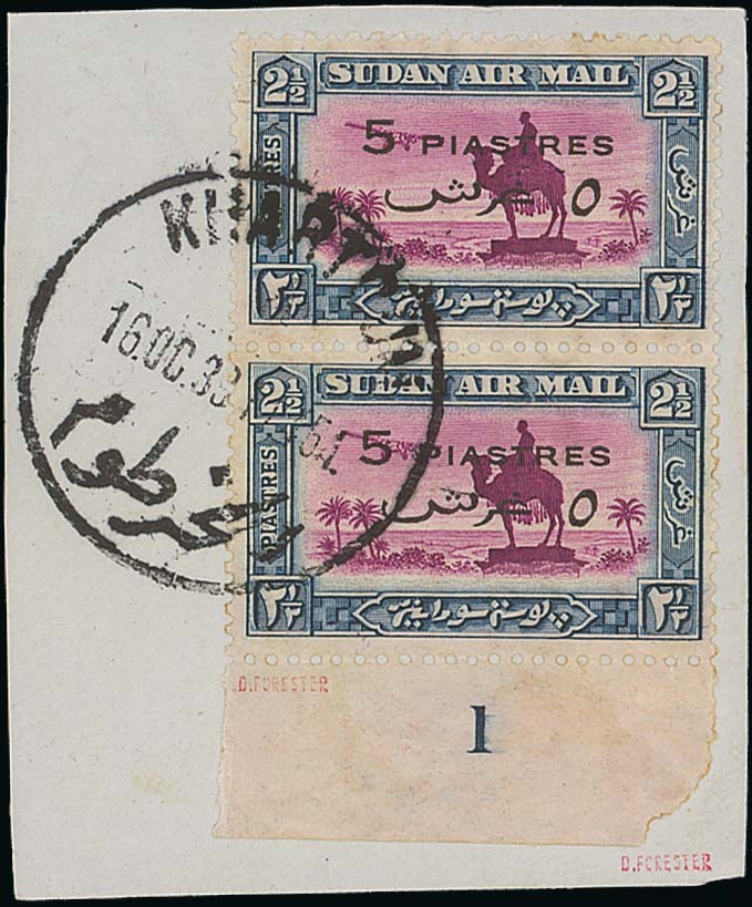 5p. on 2½p. trial printing marginal pair from the foot of the sheet with plate number, neatly cancelled and tied on piece by Khartoum 1938 c.d.s. Scarce. Cat. £800. Photo