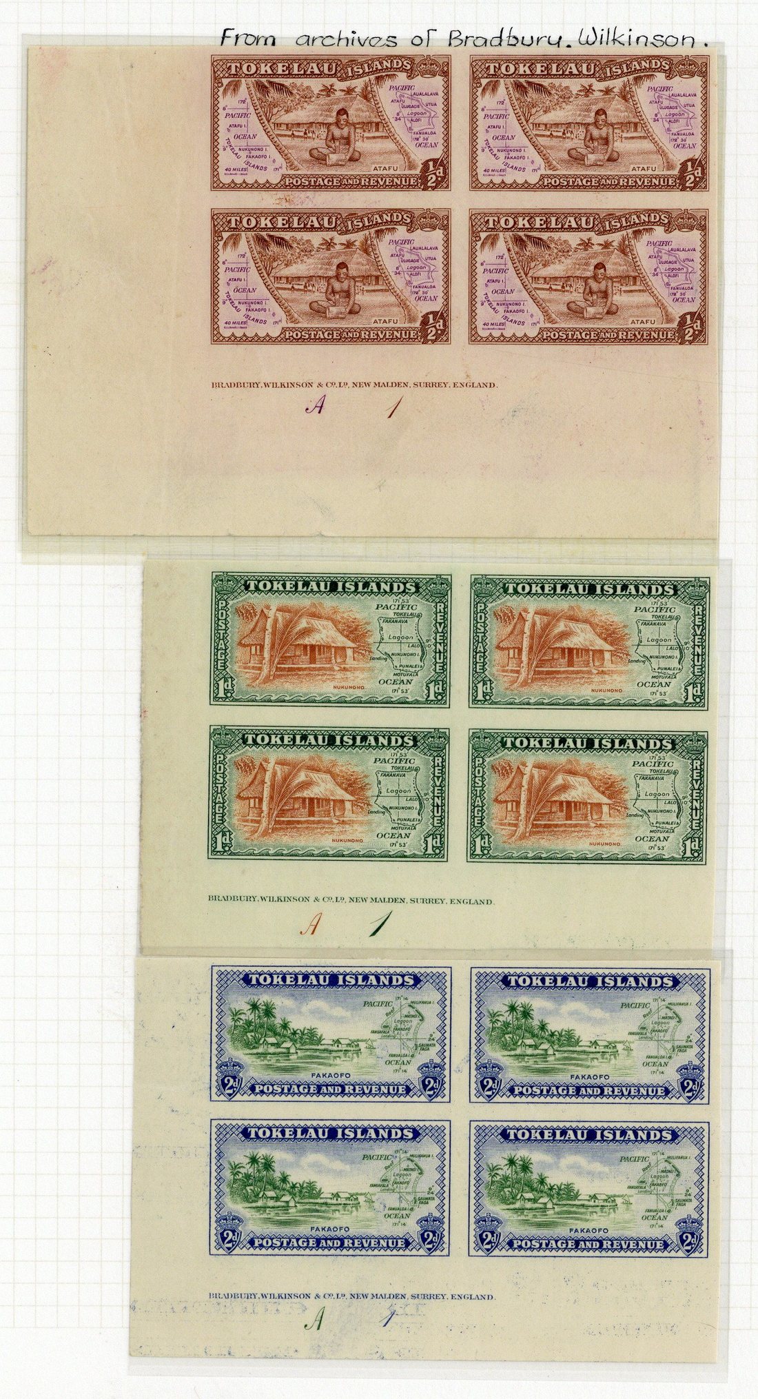 1948 ½d., 1d. and 2d., each in an imperforate lower left corner block of four with imprint and plate number, all on gummed watermarked paper, fine. Ex the printer's archive. S.G. 1-3