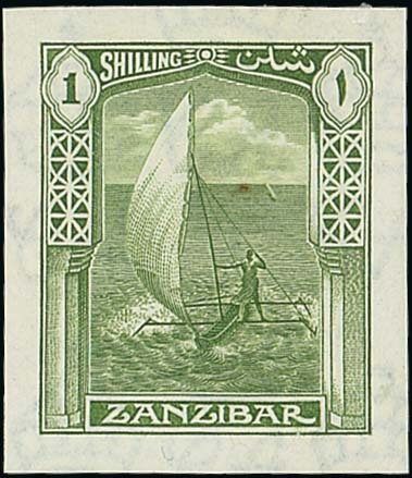 1936 1s. die proof in issued colour on ungummed watermarked paper, tiny brown speck on skyline otherwise fine. Photo