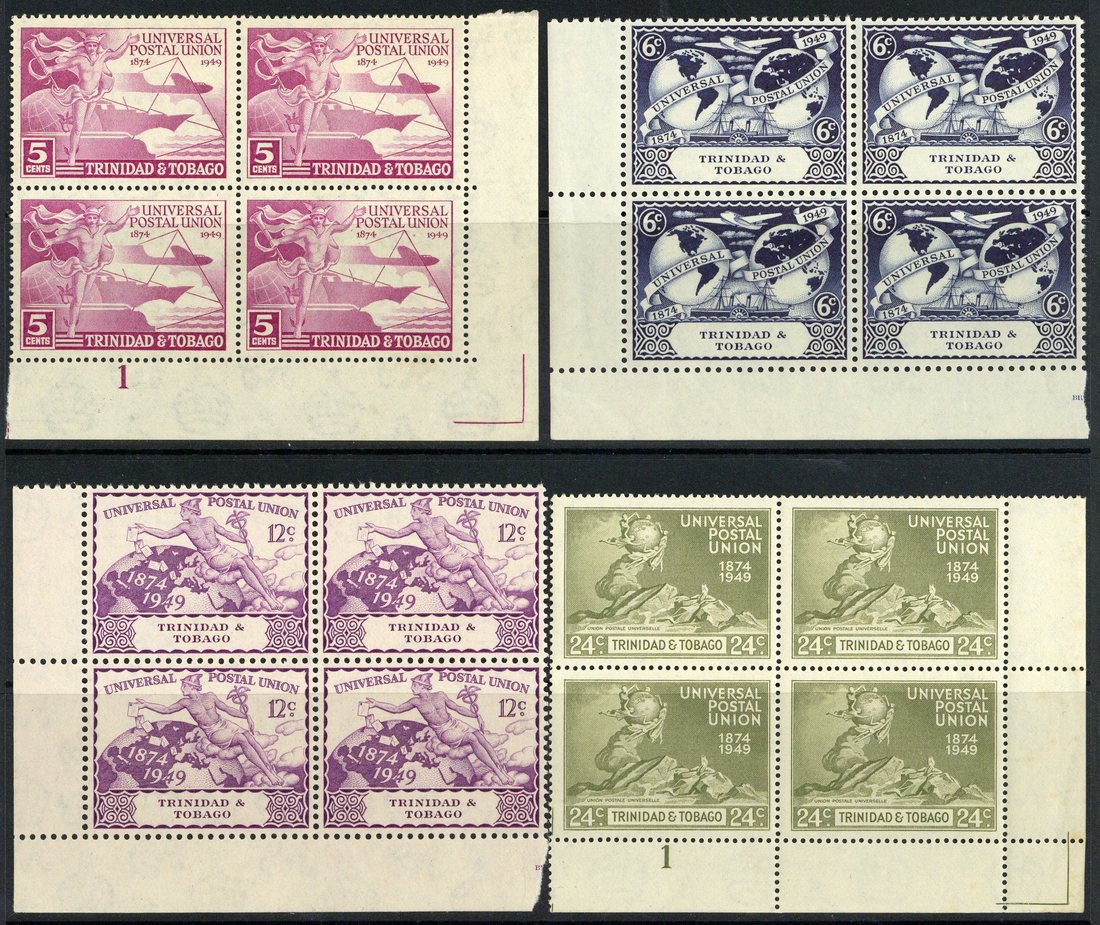 1949 U.P.U. standard design sets of four less Ascension 3d., New Hebrides French values, St. Lucia 5c. and Southern Rhodesia, each in a lower right corner block of four with plate number, fine unmounted mint. Cat. £1,000+