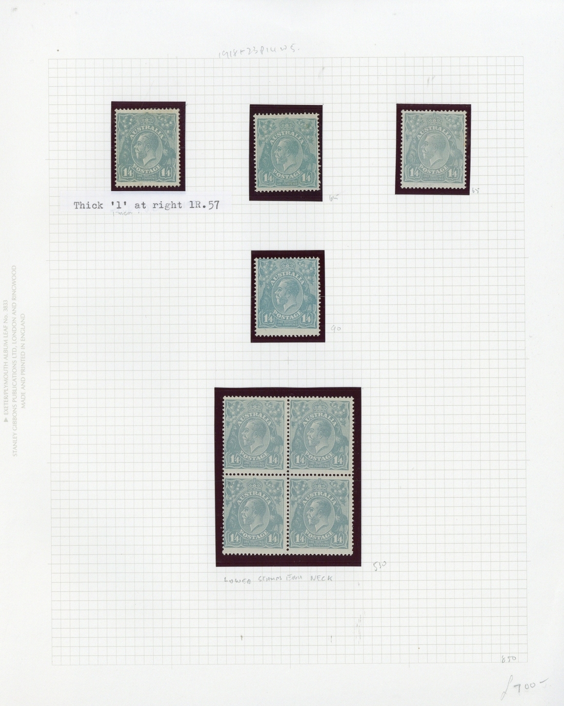 1918-23 single watermark 1/4d. pale blue block of four and singles (4, one showing thick "1" at right), and 1926-30 small multiple watermark, perf 13½x12½ 1/4d. pale greenish blue pair with Ash imprint and a single; fine mint. BW cat. $3300+