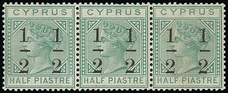 1886 (Apr.) 6mm. setting, CA "½" on ½pi. emerald-green horizontal strip of three, original gum, the third stamp a trifle soiled otherwise fine. S.G. 27, £900+. Photo