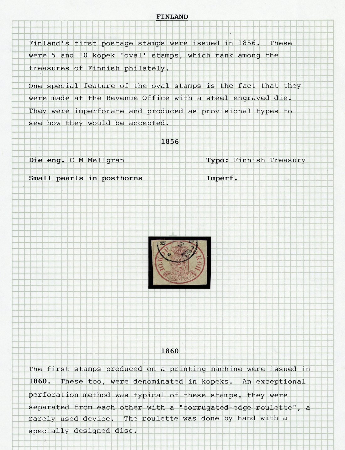 1856-1949 well written up collection on pages, many hundreds, including 1856 small pearls 10k. postmarked only on piece (faults), 1860-71 rouletted issues (33) with values to 1m., 1875 Copenhagen print 32p., 1875-84 with values to 1m. perf. 11 and perf. 12½, 1885 5m., 10m., 1889-94 5m., 10m., 1891 1r., 3r., 7r., 1901 10m., 1918 Vaasa set, 1925-29 watermark Swastikas 25p., 1927-29 watermark Posthorn 20p., 25m., 1928 Exhibition set, 1930 Red Cross, 1930 Zeppelin 10m. used, 10m. on cover, 10m. pair on flown cover, 1931 Red Cross, 1931 Granberg 1m. + 4m., 1938 F.I.S., 1948 Exhibition, 1949-50 Parcel Post, Postal Stationery with covers, cards, lettercards, Mail Stop (Village) cancellations, etc., chiefly used, mixed condition but chiefly fine and an interesting lot