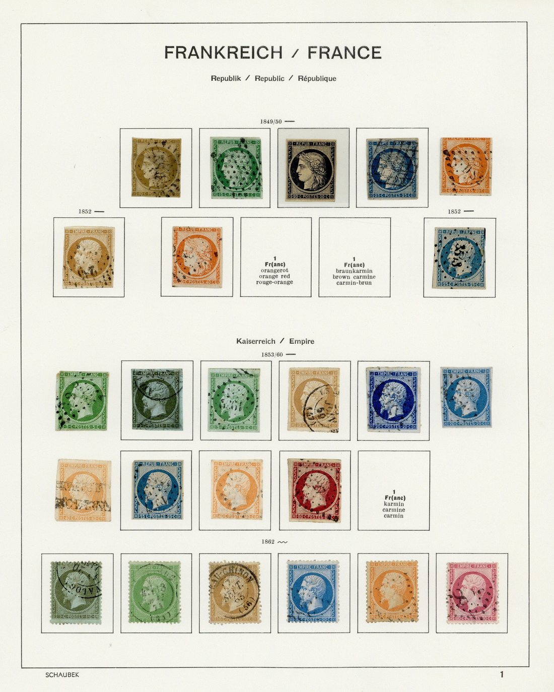 1849-2002 mint and used collection housed in two blue Schaubek albums contained in a carton, including 1849-52 15c., 40c. (2), 1863-70 4c. with red Paris cancellation, 1869 5f., 1876-85 N under B 1c., 10c. (unused), 1877-90 with values to 5f., 1900-06 Merson 2f. deep lilac and buff (used), 5f. (2), 1903 Sower 20c., 25c., 1916-19 GC paper 50c., 1917-19 Orphans 50c. + 50c., 1918 Red Cross 15c. + 5c., 1922 Orphans set, 1923-26 Pasteur, 1925 Paris 5f., 1926-27 Orphans 5f. + 1f., 1927-31 Postage Due 2f., 1930 Sinking Fund 1f. 50 + 3f. 50, 1933 Personallities, 1934 Peace, 1934 Cartier, 1935 Intellectuals, 1936 South America flight 10f. (used), 1937 Museums, 1938 Ader 50f., 1947 U.P.U. 500f., 1949-50 Paris 1000f., 1950, 1951, 1952, 1953, 1954 and 1955 National Relief sets, a very comprehensive range of later issues with miniature sheets, Council of Europe, etc., mixed condition but many fine