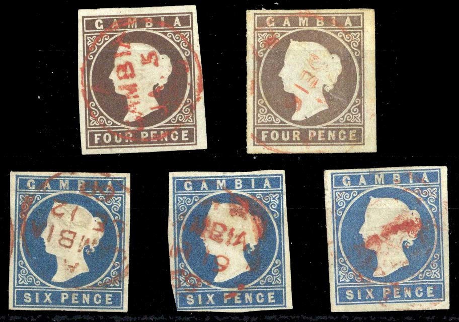 4d. brown, 4d. pale brown and 6d. blue (3, shades), all with four margins except one 6d. which is touched in one corner, all cancelled in red, one 4d. and two 6d. with clear datestamps, fine. S.G. 1, 2, 3a; £940