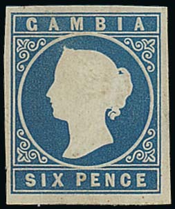 6d. blue, a pale shade with good to large margins, embossing slightly flattened, unused with large part original gum. S.G. 3a, £600. Photo
