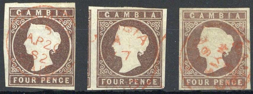 4d. brown (2), one with close to large margins and the other with small to large margins showing portion of adjoining stamp at left, and 4d. pale brown with small to good margins, all with flattened embossing and all cancelled by red c.d.s., fine. S.G. 5-6, £625