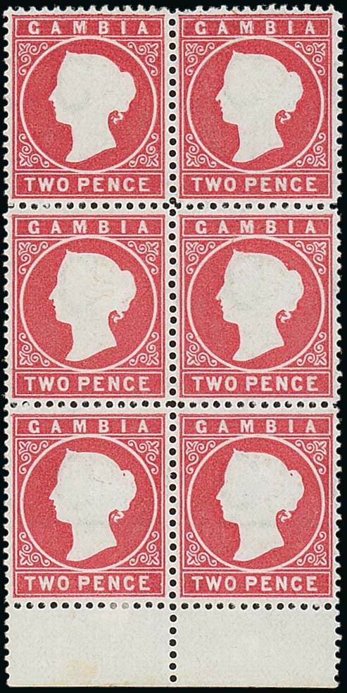 2d. rose block of six (2x3) with margin at foot, fresh and fine unused with large part original gum. Photo