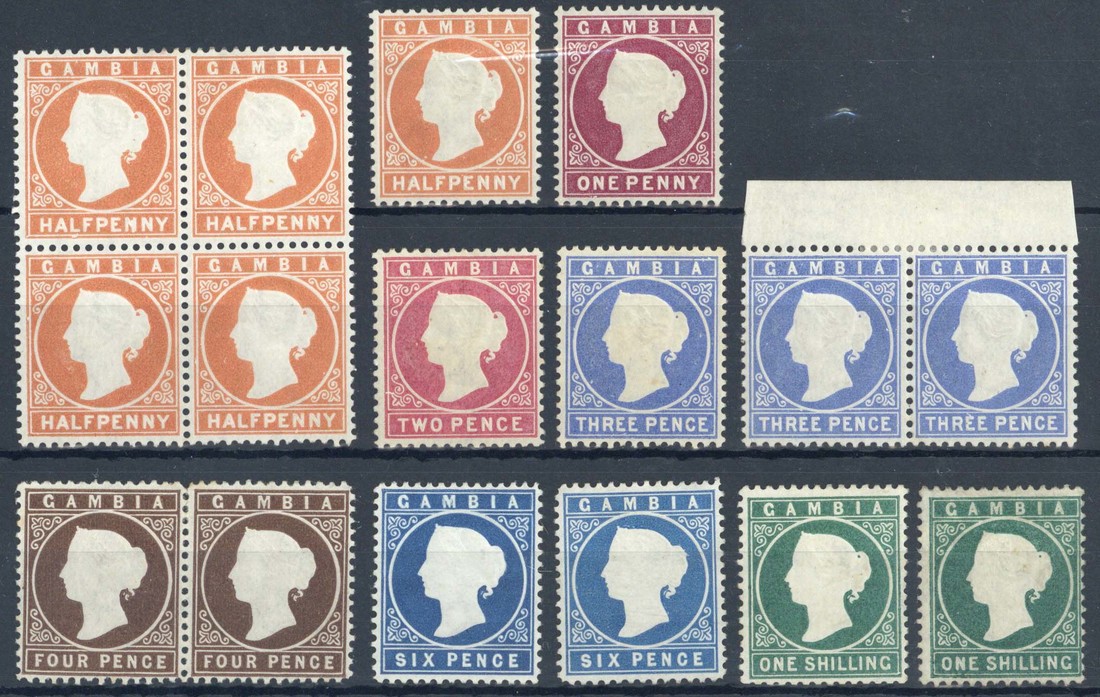 ½d. (5 including a block of four), 1d., 2d., 3d. pale dull ultramarine (3 including a marginal pair), 4d. brown pair, 6d. deep blue, 6d. blue and 1/- green (2), the 2d. and 3d. single with hinge remnant otherwise fine mint. S.G. 10B-20B, £1742