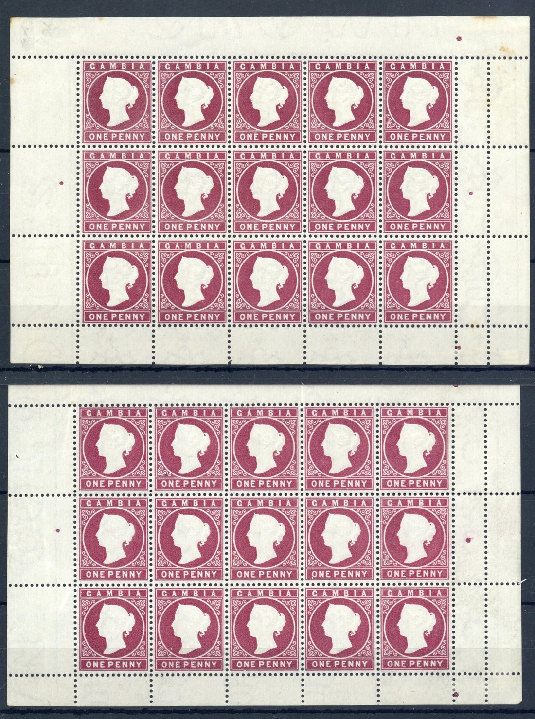1d. maroon, two complete mint sheets of fifteen in differing shades, one with some small rust marks on reverse in margin otherwise fine. S.G. 12B