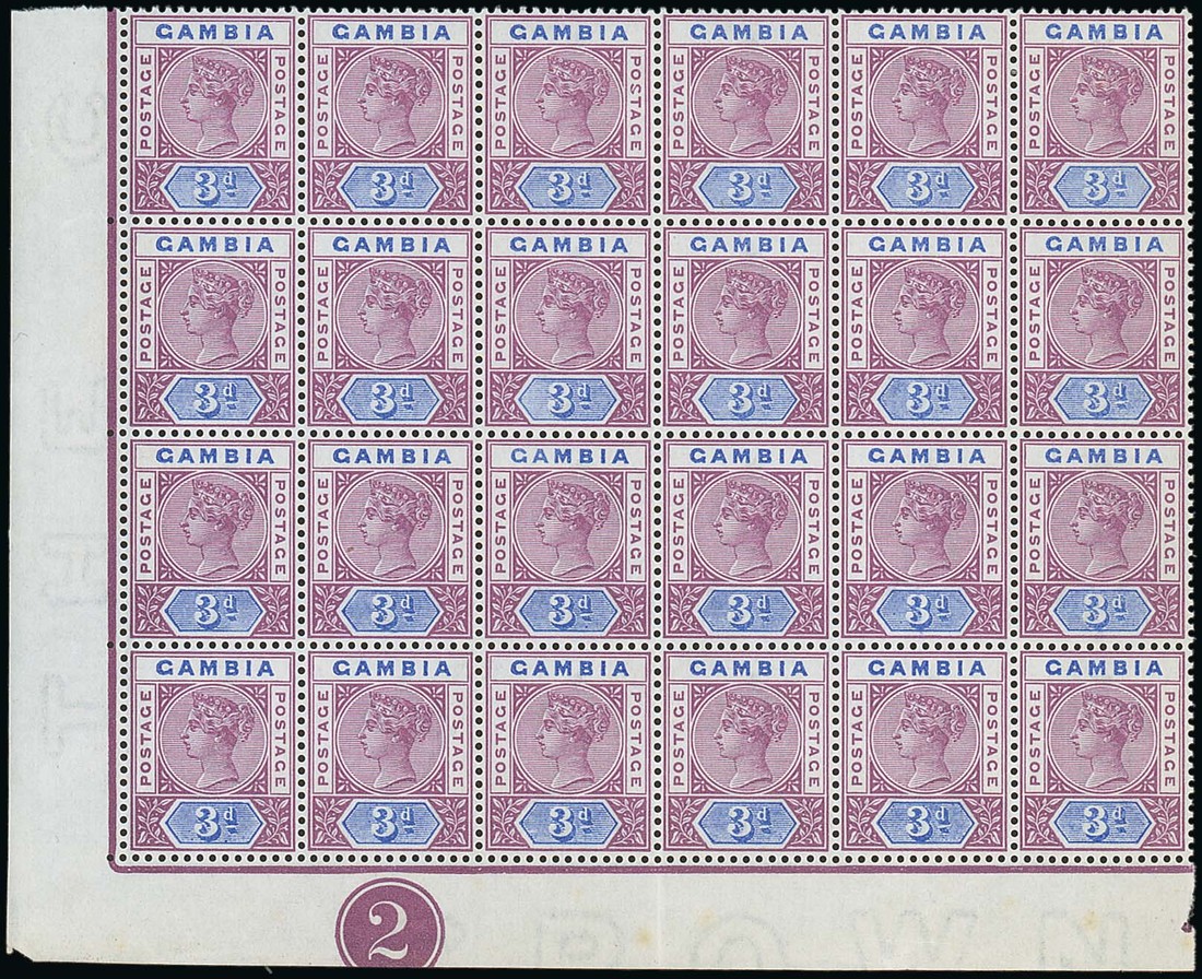3d. reddish purple and blue, a lower left corner block of twenty-four, one with malformed "s", fine mint. S.G. 41/a, £1854+. Photo