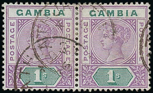 1/- violet and green pair, the left stamp with malformed "s", fine used with the variety clearly visible. S.G. 44a, £1000. Photo