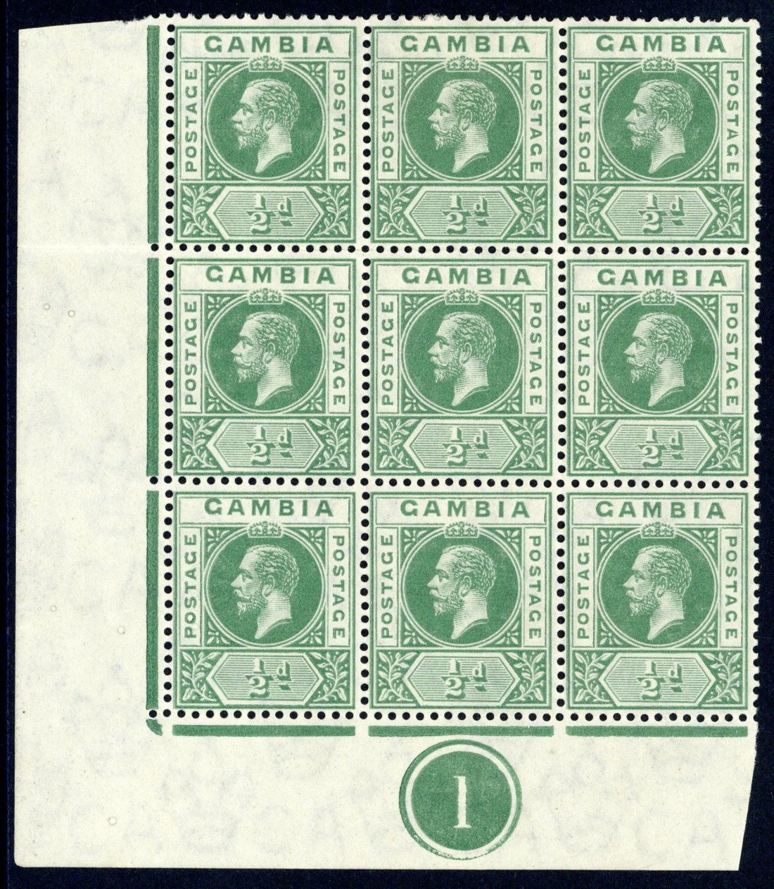 ½d. green lower left corner block of nine, the top right stamp with split "a", fresh and fine mint. A scarce positional piece. S.G. 86c