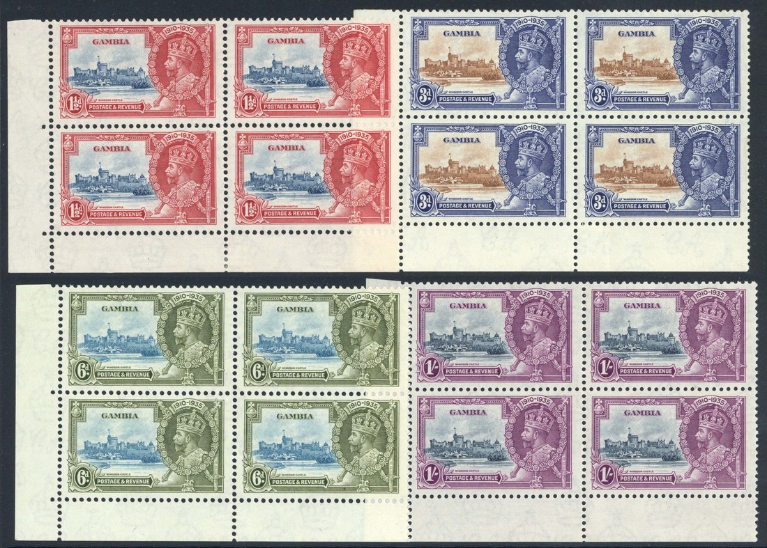 1935 Silver Jubilee set of four in lower left corner blocks of four, each showing extra flagstaff, fine mint. S.G. 143a-146a, £1000