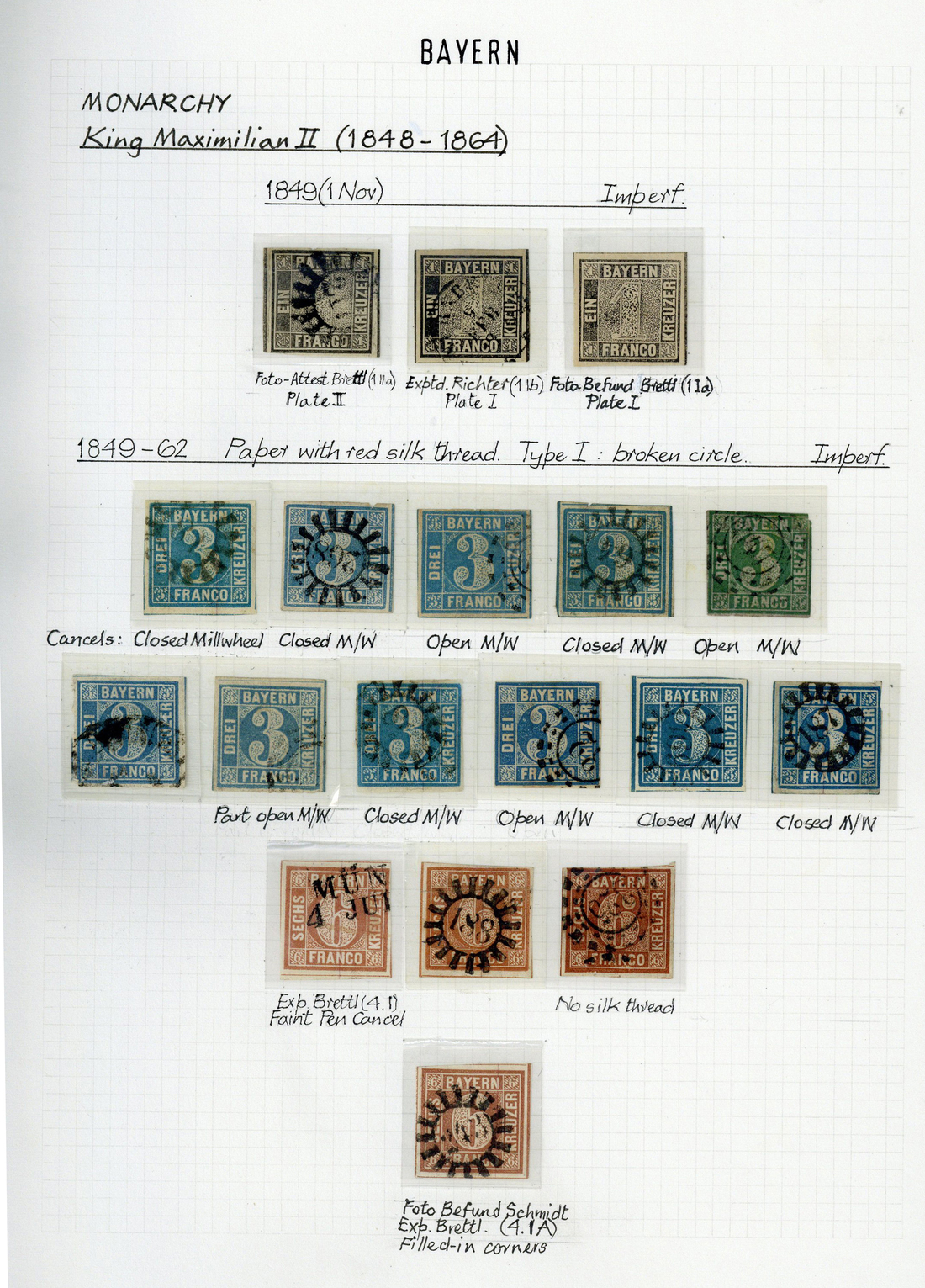 1849-1920 mint and used collection housed in a green album, hundreds, including 1849 1k. black Plate 1a with part original gum (Brettl (1988) certificate), Plate 2 used (Brettl (1995) certificate), 1849-62 6k. (4), 1850-58 12k., 18k. (3), 1862-63 18k. (3), 1867-69 imperf. 7k. Prussian blue (signed Brettl), 12k. (2), 18k., 1870 watermark 14mm. 9k., 10k., 12k. (Brettl (1993) certificate), 18k. (2), watermark 17mm. 18k., 1874 imperf. 1m. (2), 1875 7k., 10k. and 18k. (all used, signed Brettl), 1876-80 with values to 2m., 1890 unissued 2m. perf. block of four, imperf. single, 1900-06 imperf. 3m. and 5m. each with photocopy of Helbig (2008) certificates), 1911-13 Luitpold type II 1m. to 20m. used (3m. to 20m. signed Helbig), 1912 25pf. Air Mail label mint and on cover, 1919-20 set used, 1919 War Wounded set with inverted overprints, 1920 Litho. 2½m. used (signed Peschl), officials, Postage Due 1862 3k. (2), etc., chiefly fine. A valuable and useful lot