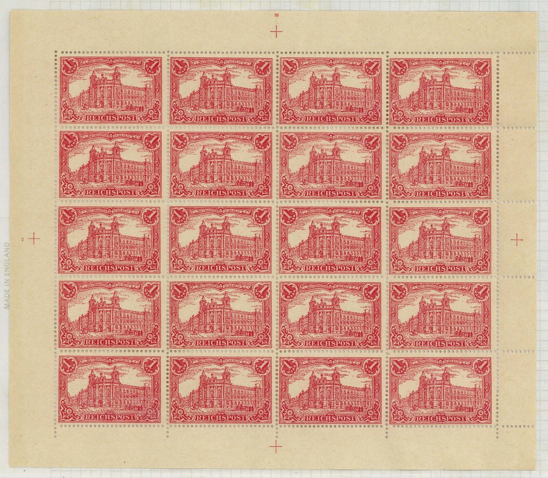 1899-1900 "Reichpost" 1m., 2m., 3m., 5m. and 5m. centre inverted, 1918 reprints, each in a complete sheet of twenty, perf. 14½ and with "nachdruck" on the reverse; fineR