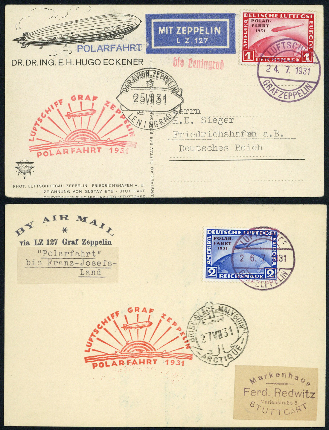 1912-39 selection of 104 Zeppelin covers and cards, including 1925 (April) Los Angeles flight souvenir envelope franked 10pf., 20pf. (2), 50pf., 1929 (Sept.) Germany flight envelope franked 25pf. with Bielfield cancellation, 1929 (Sept.) Swiss flight card franked 5pf. and Switzerland 20c., 1929 (Nov.) Zurich flight card franked 5pf., 10pf., 15pf. and 20pf., 1930 (June) Gorlitz flight cover franked 2m., 1930 (Aug.) Vaduz flight card franked 1m., 1930 Kassel flight 15pf. card franked 15pf., 20pf., 50pf., 1930 (Sept.) Geneva flight card franked 1m. and signed Leo Freund (Zeppelin wireless operator), 1931 (July) Polar flight cards franked Polar flight 1m. and 2m., 1932 (April) 3rd. South America flight card to Switzerland franked Zeppelin 1m., 1932 (Aug.) 5th. South America flight card franked 10pf., 15pf. (2) and Zeppelin 1m., 1932 (Oct.) 9th. South America flight card franked 15pf., 50f., Zeppelin 1m., etc., chiefly fine