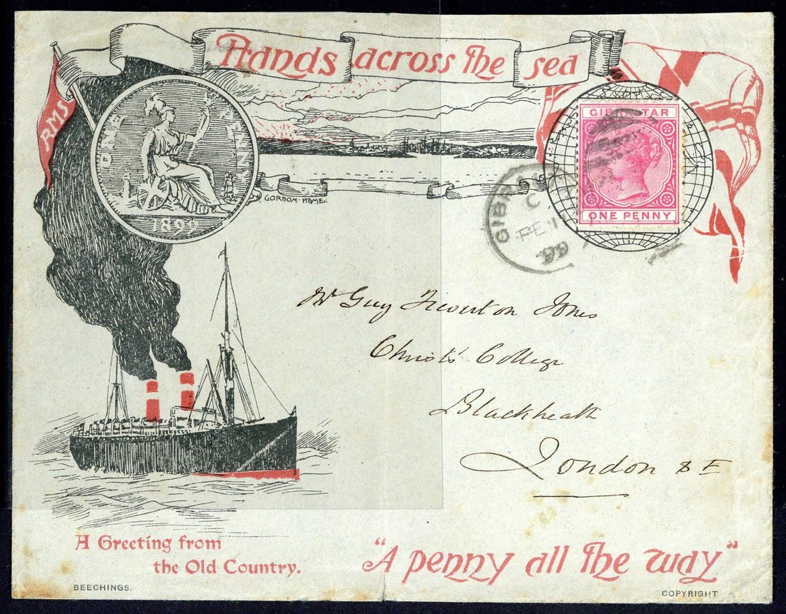 1899 (1 Feb.) "Friends across the sea" illustrated envelope to London, bearing 1898 1d. carmine cancelled with "A26" duplex, Blackheath arrival c.d.s. (15.2) on reverse; central vertical fold and a trace of soiling at lower right corner, otherwise fine and attractive.