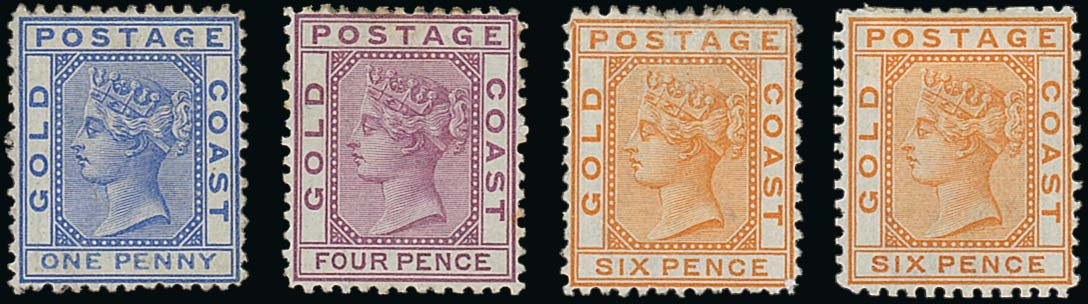 1875 (1 July) perf. 12½ 1d. blue, 4d. magenta and 6d. orange (2), the 1d. and one 6d. with large part original gum; minor imperfections though a scarce and attractive quartet. S.G. 1-3, £2,400. Photo
