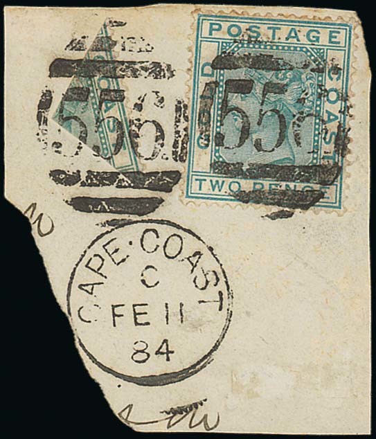 2d. green quartered and used with whole 2d. on small piece to make the 2½d. rate, both tied by "556" obliterator and showing Cape Coast c.d.s. (11.2.84) alongside, fine. B.P.A. Certificate. (1952) Photo