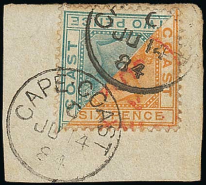 6d. orange bisected diagonally, with a bisected 2d. on small piece to make the 4d. rate, clearly tied by Cape Coast c.d.s. (14.6.84), fine. Photo