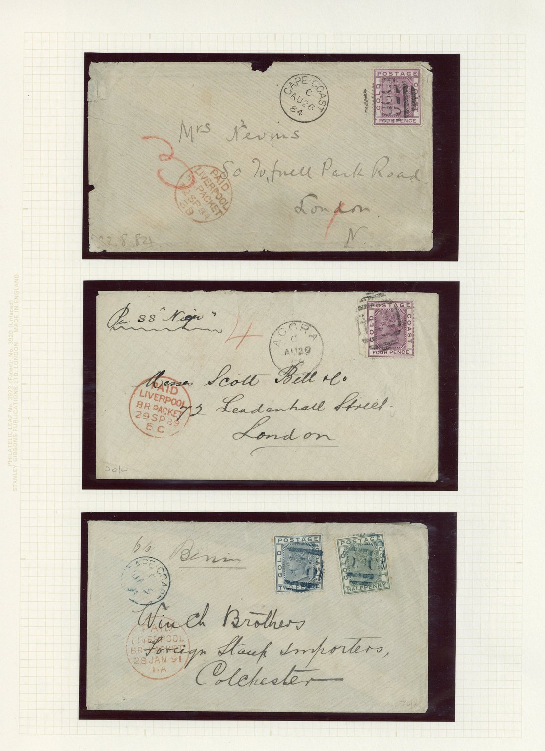1884-1897 envelopes (7) and a front, all to the U.K., the front cancelled with "northern territories/gold coast, better items including registered stationery envelope stamped "per ss gaboon, a pair of attractive bi-colour pre-printed envelopes to "Universal Woolen Manufactured Goods Emporium", others paying various letter rates with crisp c.d.s. postmarks.