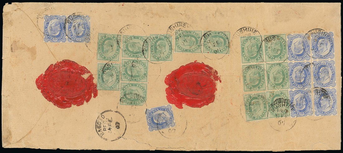Bushire: 1907 (5 Feb.), long folded envelope, registered to Kazarin, bearing on reverse Edward ½a. (14), 2a. 6p. (9), with "bushire/reg" datestamps and "bagdad/reg." transit c.d.s., on front framed "bushire" registration marking (not completed); folds and some perimeter faults. Rare. Photo