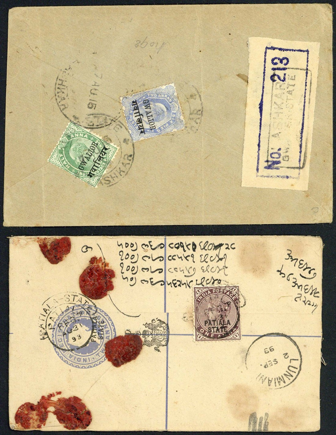 A quantity of covers, largely unused and used postal stationery though with two nice sections of Gwalior (10) and Patiala (45, mostly Q.V.) stamped covers; condition variable though an interesting lot