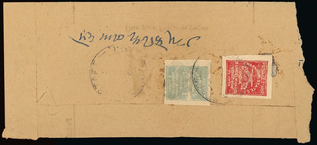 1930-45 ½a. red and 2a. light blue (blank printing flaw at right) lightly cancelled and tied on reverse of native envelope addressed locally; fine. S.G. 37, 42. Photo