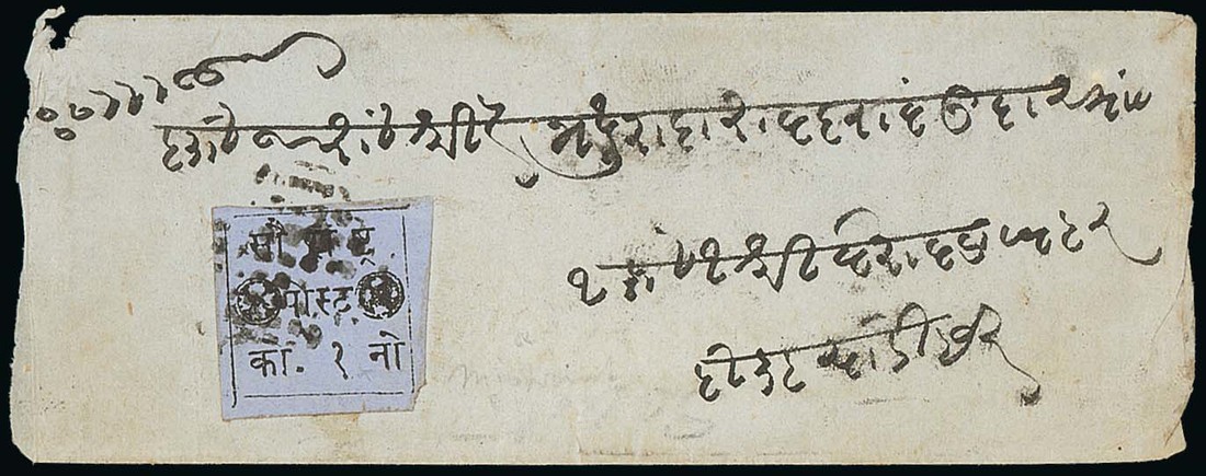 1868-75 accents over second letters in top and bottom lines, laid paper 1a. black on azure, variety first two characters in last word of bottom line omitted, clear to large margins and tied on small native envelope addressed locally. A scarce variety on cover. S.G. 11b. Photo